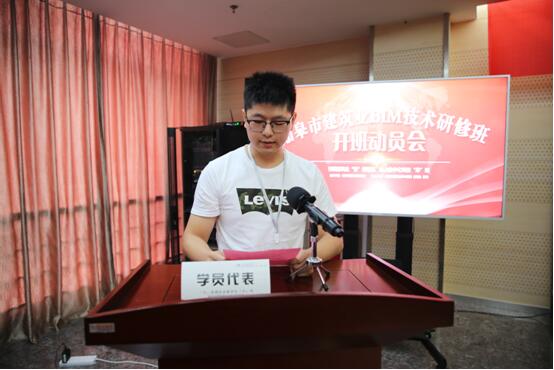 源豐建設BIM負責人劉肖肖作為學員代表發(fā)言,與大家分享之前參加南通六建BIM培訓中心軟件學習和應用的心得體會,他相信在社會各級領導的支持幫助下、在所有建設者的不懈努力下,BIM必將星火燎原!同時他代表學員表態(tài):認真學習,以優(yōu)異的成績向祖國建國70周年獻禮!