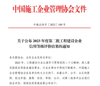 10月11日,中國施工企業(yè)管理協(xié)會(以下簡稱“中施企協(xié)”)2023年度第二批工程建設(shè)企業(yè)信用等級評價結(jié)果正式公布,集團(tuán)恢復(fù)“企業(yè)信用評價AAA級信用企業(yè)”稱號。
